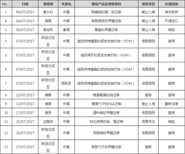 上月根据欧盟RASFF官方网站通报了2017年第27周通报统计得出以后,全球出口欧盟地区产品多项检测不出现问题,共计83项,而针对中 国运输出口欧盟茶农共计7项,针具通报总数的8%,而针对欧盟食品和食品接触辅材产品,也就是说也有硅胶制品一样包括在内,共计有 13列与食品接触产品,而共计12项来源于中国。
