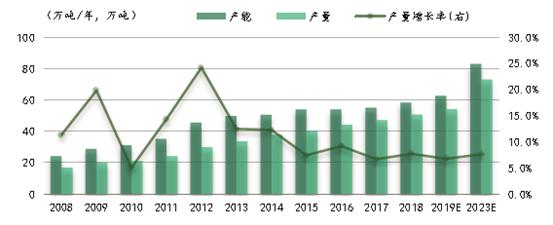 根据SAGSI年报数据分析,中国RTV产能一直处于稳步增长中,2012-2016年增长最为明显,2018年中国RTV产能达到120万吨/年,同比增长6.7%,随着中国大量新建RTV项目的新建,SAGSI预测2019年,中国的RTV产能将达到到128万吨/年,同比增长6.7%,产量将达到到87万吨/年,同比增长10.1%。