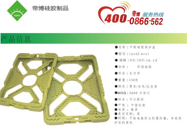 平板硅胶保护套与手机硅胶保护套相比远远不足手机套的广泛,不过从发展历程上来看却比手机保护套要问世的早很多,所以如今市场上来硅胶手机套的数量远远多于平板保护套,不过随着近几年美国苹果公司连绵不断的推送出ipad,全球知名电子平板都不断的研发,让不少硅胶制品厂家都在以硅胶保护套为主,大力度开发保护套新模,各种不同型号,不同规格的模具,比如帝博硅胶制品厂家先如今已经在保护套模具上开发不少于30套大模,为市场提供不同规格型号的硅胶保护套!
